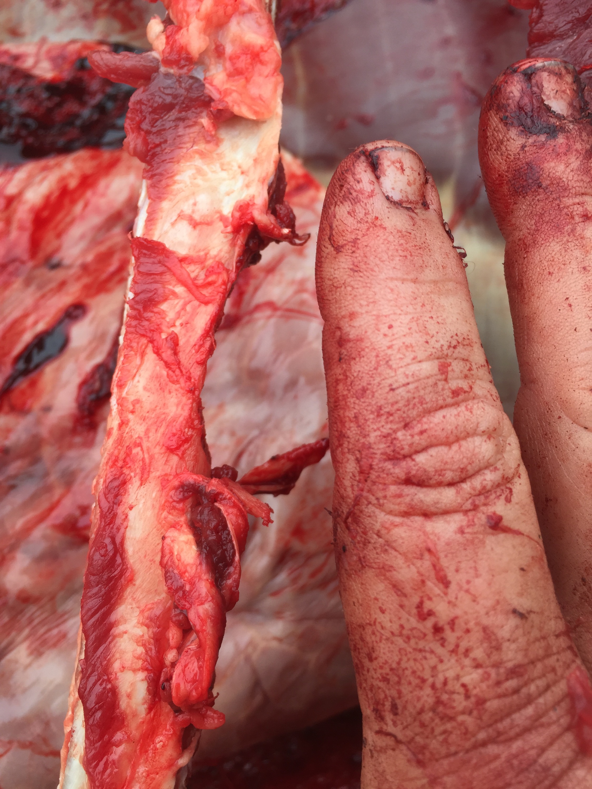 We went back to the “Nyala” blind the next morning in hopes of seeing it again. No luck on the Nyala but a herd of Impala came to the blind. Heinrich pointed out the best one and Wyatt made a good 20 yard shot. It fell within sight of the blind. After the trackers picked up his Impala we got back into the blind. It wasn’t long until a herd of Blue Wildebeest came in. The biggest one turned broadside at 30 yards. Wyatt had to wait for an Eland to move for a clear shot. His shot looked good at first but after it walked a hundred yards and laid down it was obvious it wasn’t a good shot. I later learned how to cock his Ravin silently but at the time I didn’t know how and the clicking of the crank spooked the wildebeest and he walked off. No I wouldn’t let him take a 100 yard shot on an animal but a wounded animal is a different story. This is when I learned what a good tracker was. Working as a guide for several years I felt like I was a pretty good tracker but after watching these guys; I would give my skills a 1. I went with the trackers and we walked 3 circles. The whole time I’m thinking these guys are just looking for a body there is no way they are tracking. Sure enough we jump the wildebeest. They track it to a road. We mark the spot and go eat lunch. Upon returning we drop off the trackers and circle around to the other side of the bush. They find it within 200 yards of the road. The shot would have been perfect on a whitetail so obviously it was too far back for an African animal. The vitals are straight up the leg vs behind the leg.