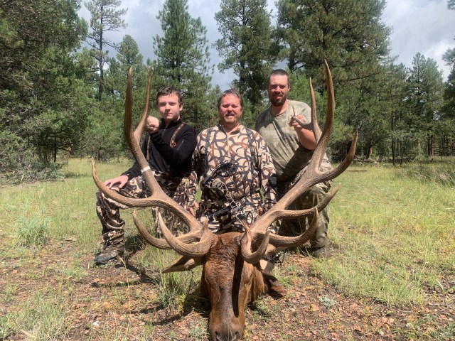 Up to this point I was feeling really down. I even said find it or not, I’m done. I have to give my son a lot of credit. He tried to keep me upbeat and happy. My mood changed immediately after it was recovered and I was ready to go hunting again. Heinrich said the trackers had found a spot that some really nice Gemsbok were frequenting. They built a blind out of burlap and limbs and we got set up by 2:00. Sure enough the Gemsbok started coming in and Heinrich pointed out the best one. In order to stay concealed they had only left a very small hole to shoot through. I had a hard time getting a good shot at the one he told me to shoot. He was either quartering to or there would be other Gemsbok in the way. He spooked a little bit but he stopped and gave me a quartering away shot. When I drew back to shoot, Heinrich took down the camera for fear of getting shot. That’s how small the hole was. We heard the crack of bone as the arrow hit the opposite shoulder. Another “perfect” shot and again we told the trackers to bring the trailer. After tracking a couple miles it was obvious the shot wasn’t actually that good. This particular section of the property had a lot of roads. We would circle around and try to finish him with the rifle as the trackers stayed on the track. At the first crossing Heinrich gave me his .375 to finish him. Heinrich started saying there he is shoot, shoot; but for the life of me I couldn’t see him. Just as I handed the rifle to Heinrich the Gemsbok ran across the road and he took a shot. He hit it in the ass and that Gemsbok didn’t even slow down. The next crossing didn’t yield a shot because it was a narrow opening and he ran across too fast. At the next crossing the trackers call on the radio to let us know they found him. They walked up on him and as he tried to get up they finished him off with another shot. The skinners said the arrow had broken a rib on entry, but it turned the arrow enough so that it only got 1 lung. This is when I wished for the 250 grain head. Not sure if it would have made a difference, but I think it might have.